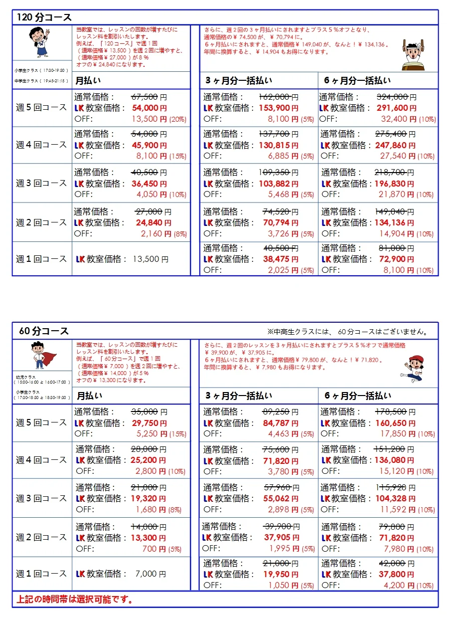 授業料は、月払い、3か月払い、6か月払いをお選びいただけます。お支払方法は、口座振り込み、または手渡しでお願いいたします。月払いの方は、月謝袋をご利用の方は第3週目に袋をお渡しいたしますので、第4週目のレッスン日にお持ちください。
